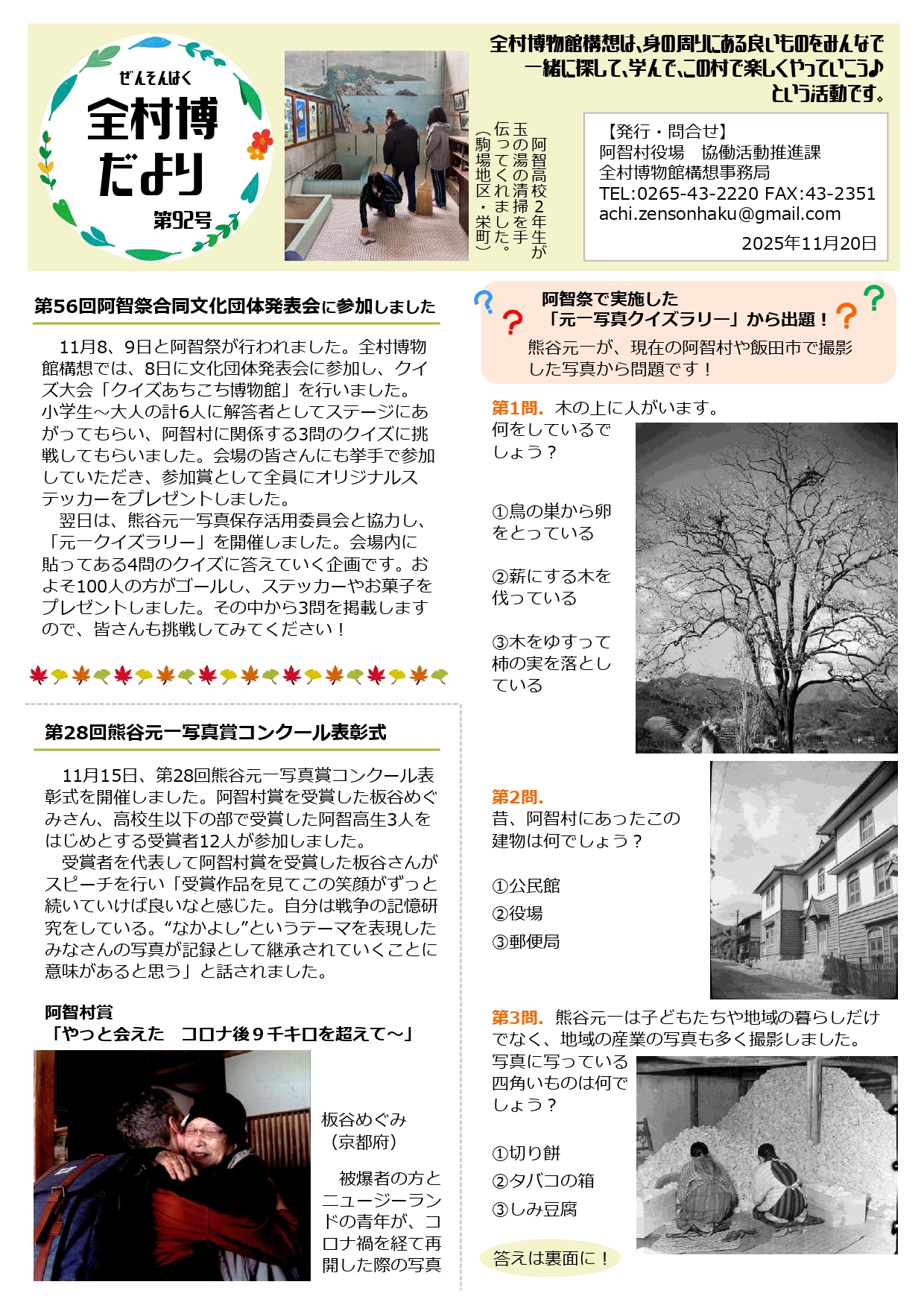 11月8、9日と阿智祭が行われました。全村博物館構想では、8日に文化団体発表会に参加し、クイズ大会「クイズあちこち博物館」を行いました。