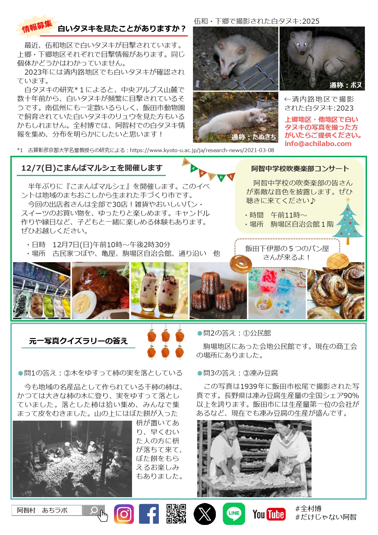 白タヌキの研究*1によると、中央アルプス山麓で数十年前から、白いタヌキが頻繁に目撃されているそうです。南信州にも一定数いるらしく、飯田市動物園で飼育されていた白いタヌキのリュウを見た方もいるかもしれません。全村博では、阿智村での白タヌキ情報を集め、分布を明らかにしたいと思います!