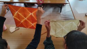 智里西地区の女性グループ「あじさいクラブ」で、草木染め体験を実施しました。「身近な植物で染めたい」とのリクエストだったので、玉ねぎの皮と桑の葉の2種類で染めました。
