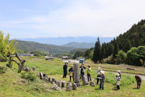 髙坂さんは「村の人がお金を出し合ってつくった石碑も多く、当時の村の共同の力が見えた。信仰などかつての人々が大事にしたものが見えてくる。」と話しました。歴史を知る会メンバーお手製リンゴケーキの差し入れをいただきながら、自分の暮らしている地域を知る楽しさを共有する時間を過ごしました。