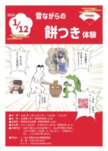 かまどで蒸かしたもち米を使って、臼と杵で餅をつきます。つきたての餠は『きな粉』や『おしるこ』、『大根おろし』など、いろんな味で楽しめます。11時からと12時半からの2回、開催します。