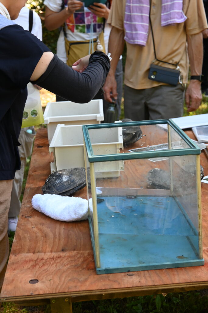 ぬけがら探しは伍和・備中原つつみ公園で行い、セミやヤゴのぬけがらを見つけました。また「備中原環境保存会」の皆さんによるカラスガイの解説を聞きました。
