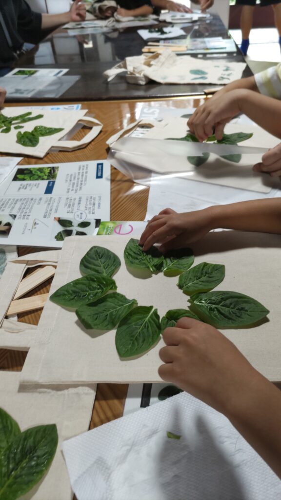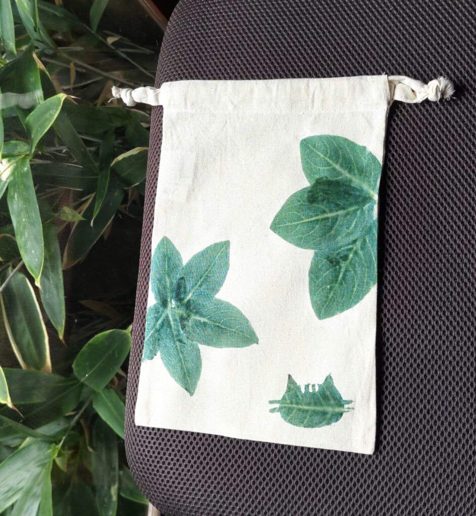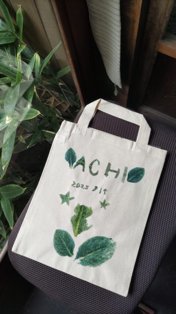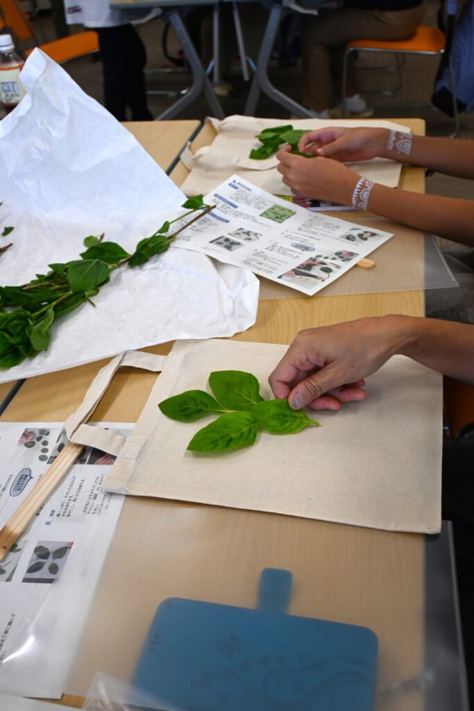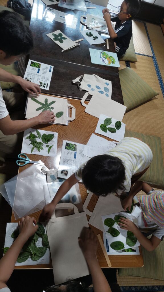 9月13・14日に古民家つぼやで「藍のたたき染め体験」を開催しました。つぼやの庭から藍の葉を摘み取ってきて布の上に置き、こすって布に色を移し、オリジナルバッグや巾着を作りました。