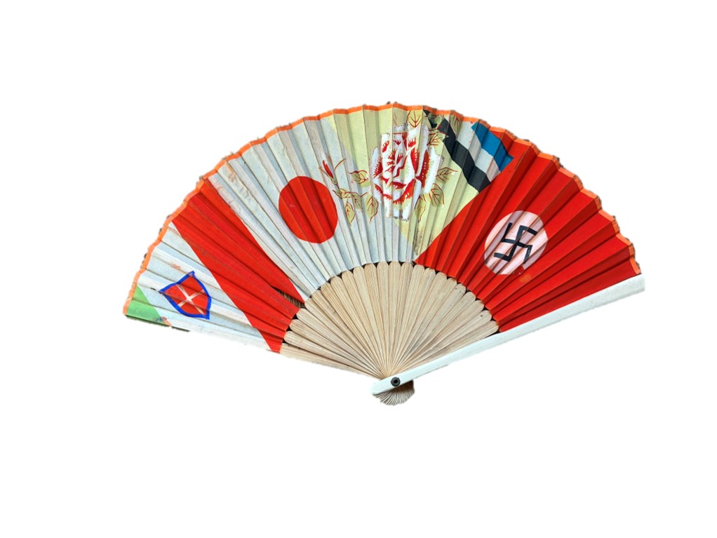 駒場地区の蔵の中にあった扇。4ヵ国の国旗が印刷され、中央部分にはバラの絵が描かれている。
