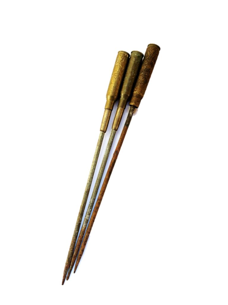 薬莢部分に「旅順」「出征」「紀念」と彫り込まれている。当時、土産品として売られていたと思われる。戦後は個人宅で火箸として使用されていた。