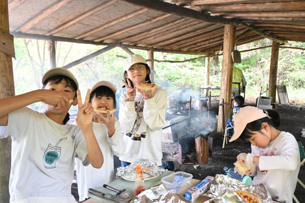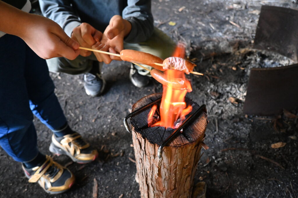 その後、40㎝位に切った丸太に火をつけ、ピザやソーセージを焼いて味わいました。