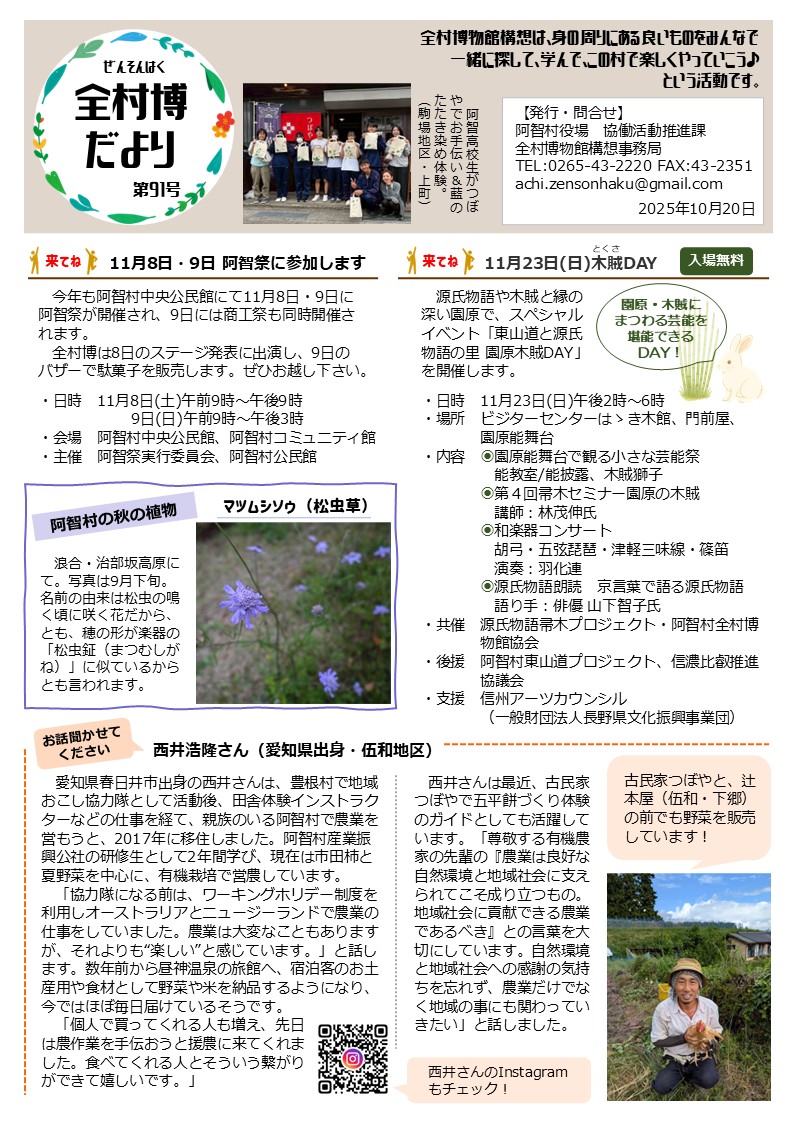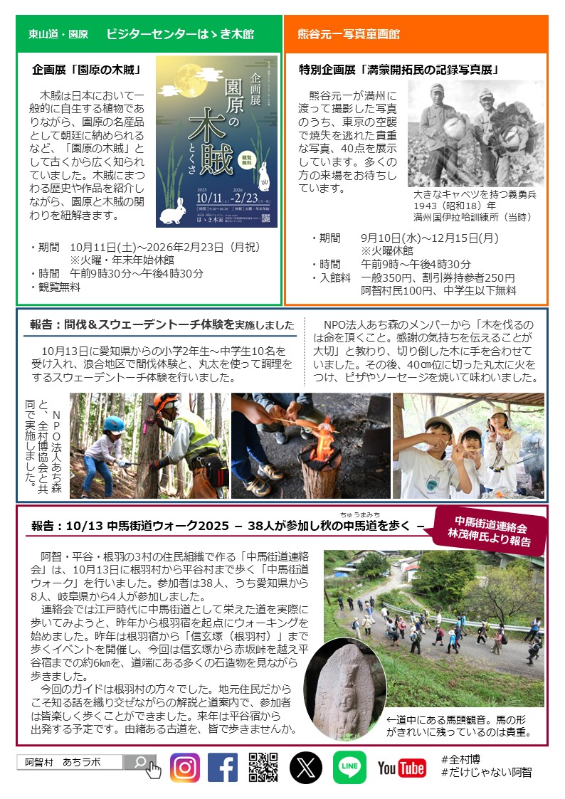 今年も阿智村中央公民館にて11月8日・9日に阿智祭が開催され、9日には商工祭も同時開催されます。全村博は8日のステージ発表に出演し、9日のバザーで駄菓子を販売します。ぜひお越し下さい。