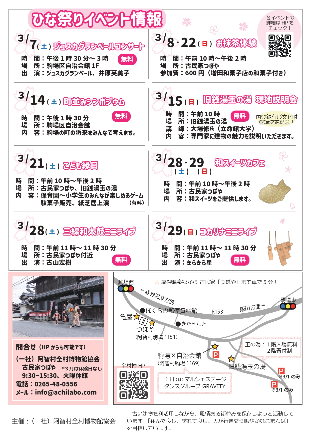 • 会 場:古民家つぼや(阿智村駒場1151)、古民家亀屋、駒場区自治会館(阿智村駒場1169)、通り沿い(旧駒場商店街)