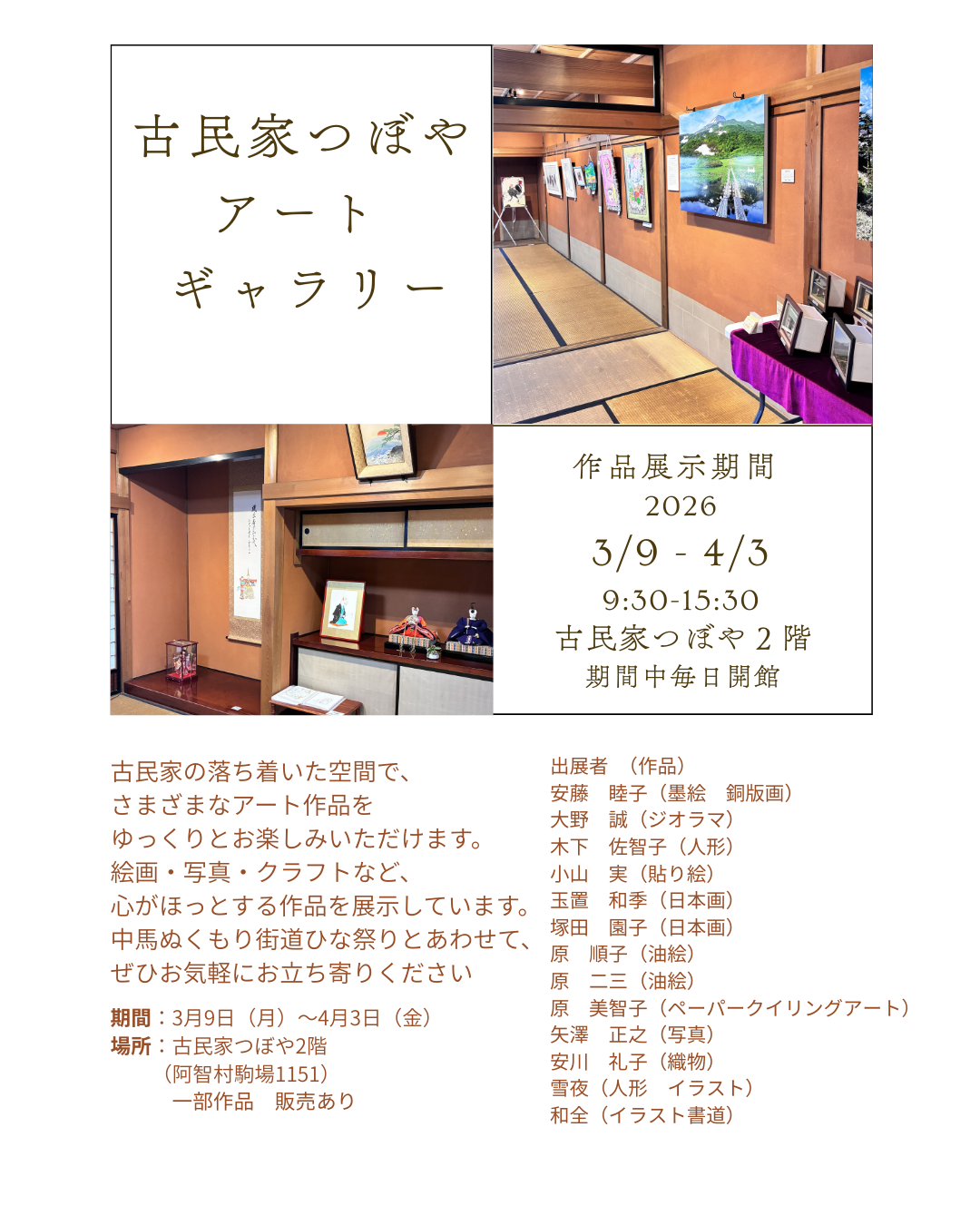 絵画・写真・クラフトなど、心がほっとする作品を展示しています。中馬ぬくもり街道ひな祭りとあわせて、ぜひお気軽にお立ち寄りください。