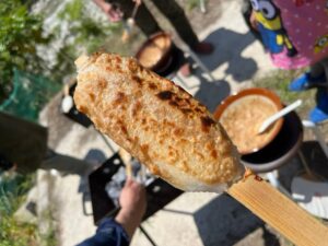 特製クルミだれも作ります。(※クルミアレルギーがある場合、クルミ以外のたれも対応可能です)炭火で焼く、できたて五平餅の味は格別です♪