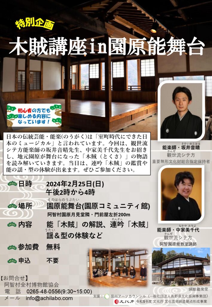 雪のため、会場を阿智村中央公民館(阿智村駒場468₋1)に変更します 日本の伝統芸能・能楽(のうがく)は「室町時代にできた日本のミュージカル」と言われています。 今回は、観世流シテ方能楽師の坂井音晴先生、中家美千代先生をお招きし、地元園原が舞台に... -