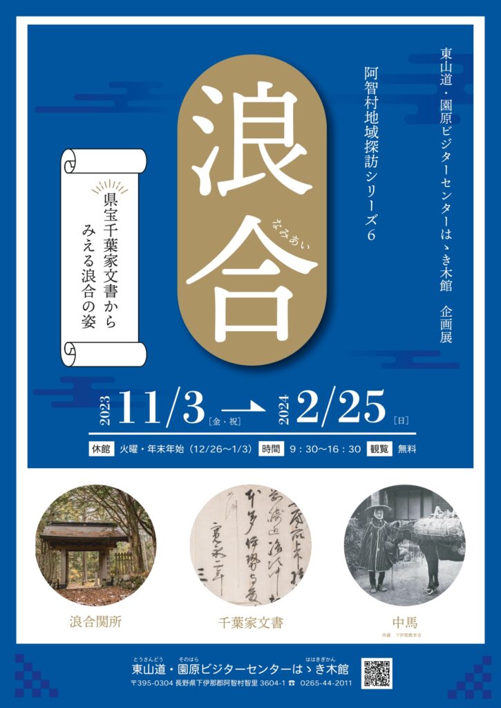 東山道・園原ビジターセンターはゝき木館で開催中の企画展『浪合展』に関連した学習会を開催します。講師は浪合展を監修して頂いた吉田ゆり子氏です。吉田氏は長年千葉家文書を研究されてきました。この貴重な機会にぜひご参加ください。 日時 2月3日... -