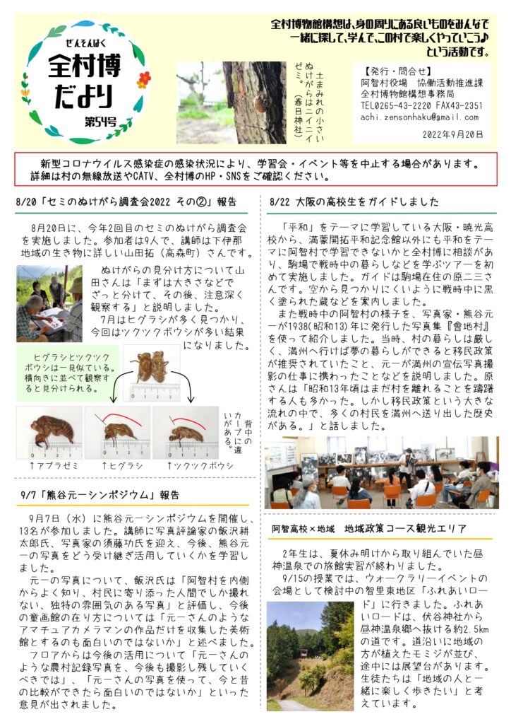 掲載記事 8/20「セミのぬけがら調査会2022 その②」報告 8/22 大阪の高校生をガイドしました 9/7「熊谷元一シンポジウム」報告 阿智高校×地域 地域政策コース観光エリア2年生 東山道・園原ビジターセンターはゝき木館(HPはこちら) 企画展 地域探訪シリ... -